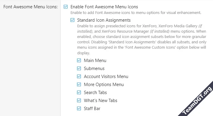 • Font Awesome Menu Icons enhance your menus with eye-catching icons. This feature is seamlessly integrated with XenForo’s native Font Awesome icon sets (XF 2.3+). MenuFlex comes with 'Standard Icon Assignments' preselected for all XenForo, XenForo Media Gallery (if installed), and XenForo Resource Manager (if installed) menu options. Flip it on with just a couple checkbox options and/or dive deeper into the add-on options for more Font Awesome customization capabilities. Assign custom icon styling (Light, Regular, Solid, or Duotone) to all your icons with a single click. Want more customization control? Our custom singles, pairs, trios, and quads will allow you to customize your site’s Font Awesome icons individually with style and color. MenuFlex's Font Awesome Menu Icons will work with all XenForo menu options, your own personal menu options, or menu options created by any other XenForo add-on. For more details check out the FAQs.