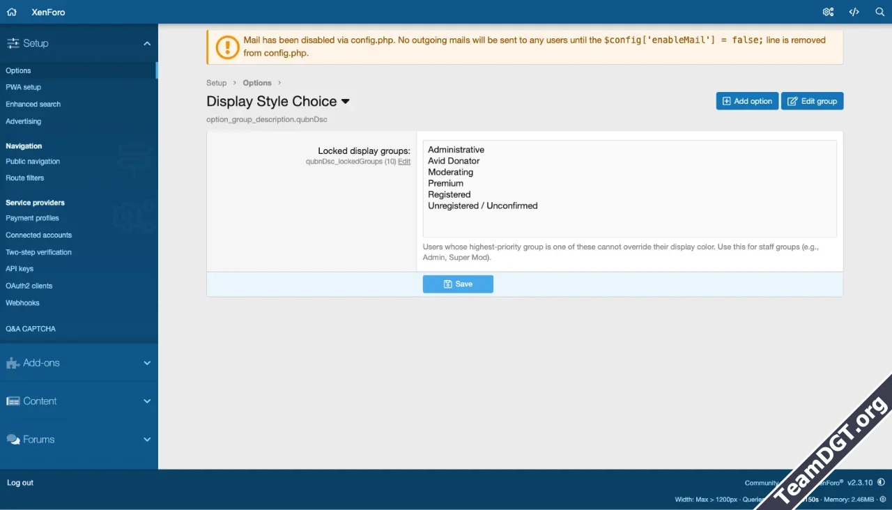 After installation, visit Admin CP > Options > Display Style Choice:- Locked staff groups - select which user groups should be unavailable for user selection. Users belonging to locked groups will still see them listed but cannot choose them as their display style.