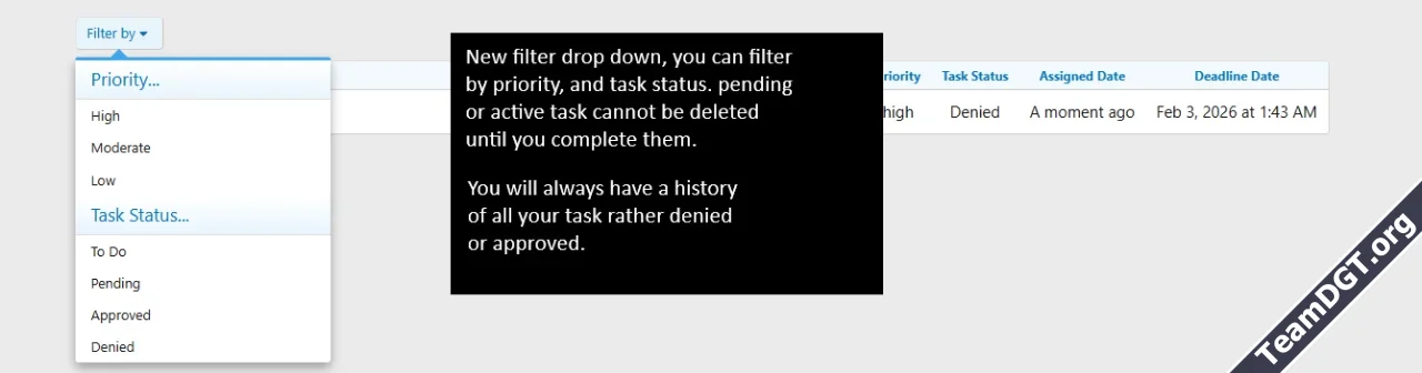 Staff members can create new tasks, assign them a priority level, and keep everything organized in a clean, centralized task list. Tasks can be approved or denied, ensuring proper review and accountability before action is taken. Tasks are displayed by priority, making it easy for staff to focus on what matters most.