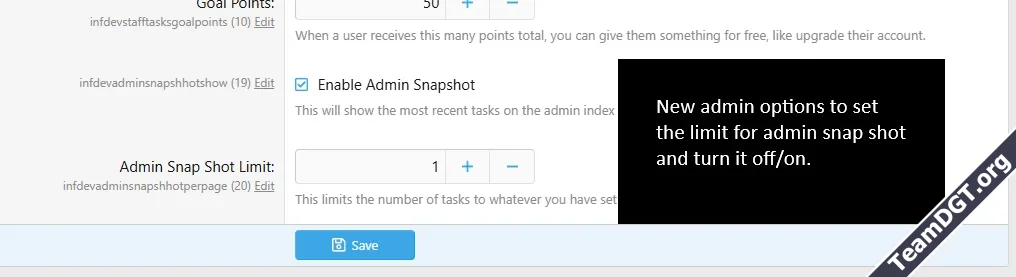 Admin snap shot - show the latest 5 tasks on the admin index page.
