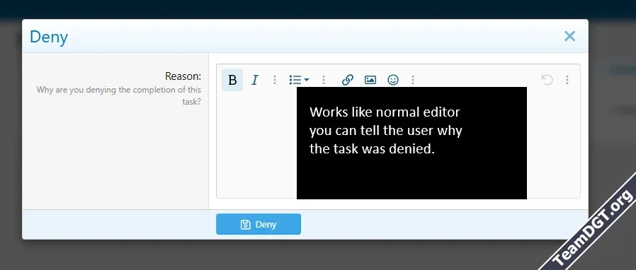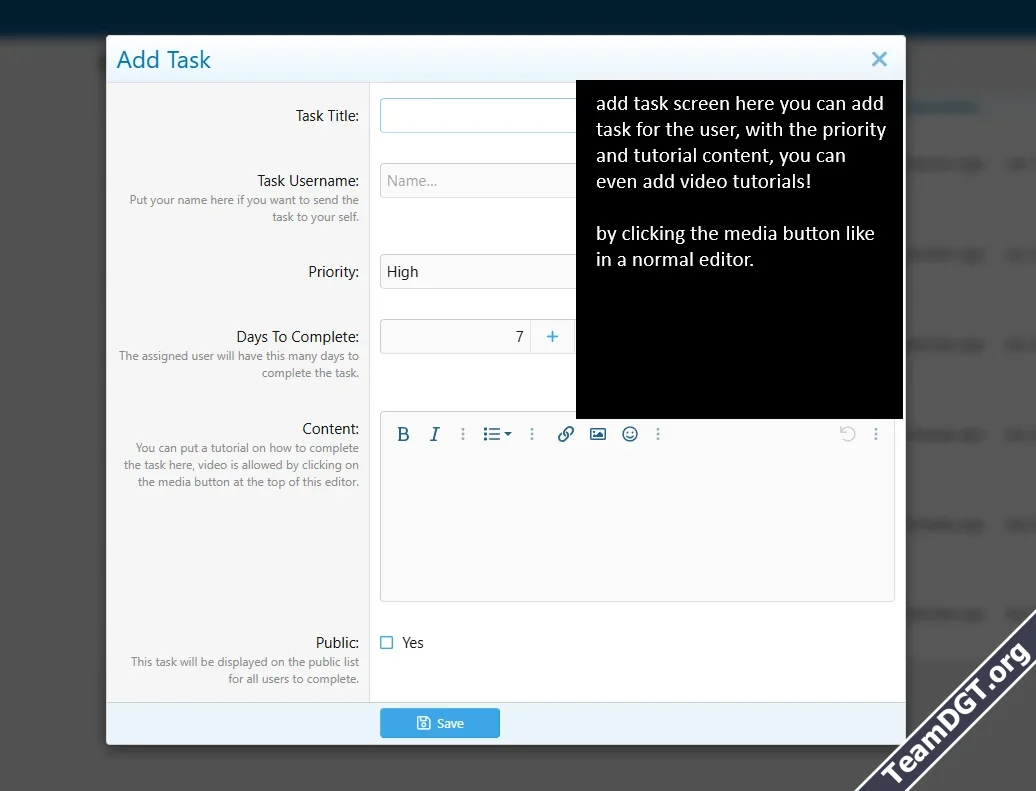 Tutorials, when a staff assigns a task, they can give the user a tutorial, and even post video tutorials it works like the normal editor.