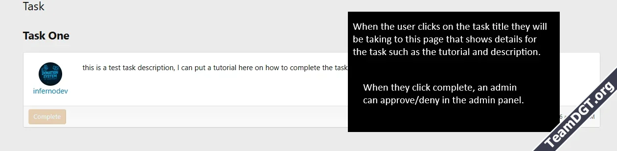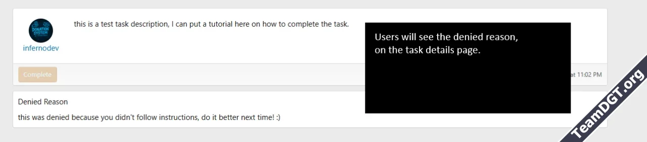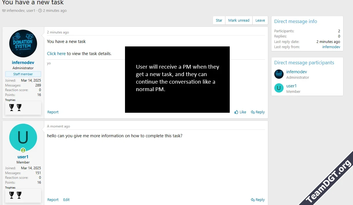 NEW PM/CONVERSATION when a user receives a new task and a task is denied, they will be able to continue the conversation with staff if they need help completing the task.