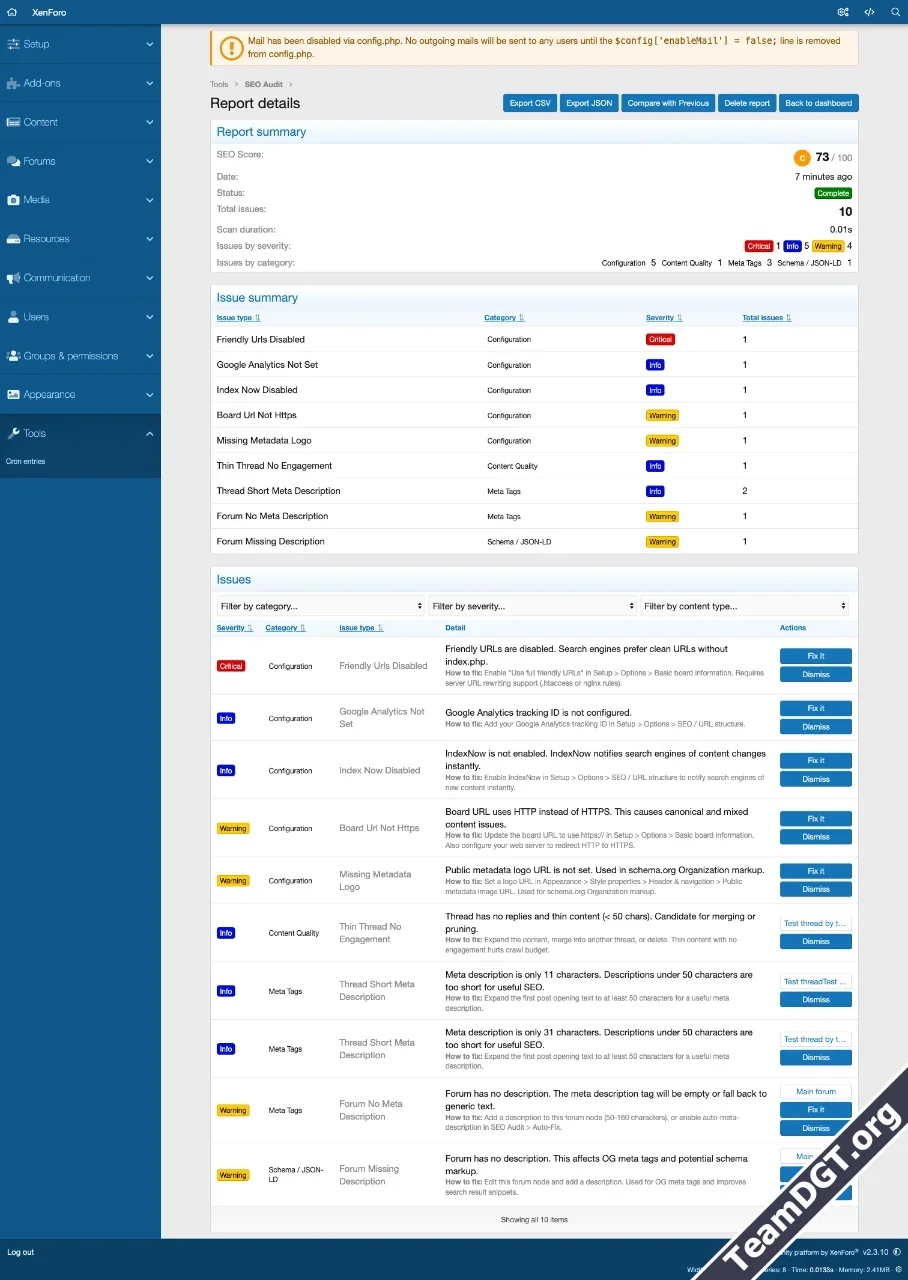 A comprehensive SEO auditing dashboard for XenForo administrators. Scan your forum for SEO issues, review detailed reports with severity grades, and auto-fix common problems, all from within your Admin CP.