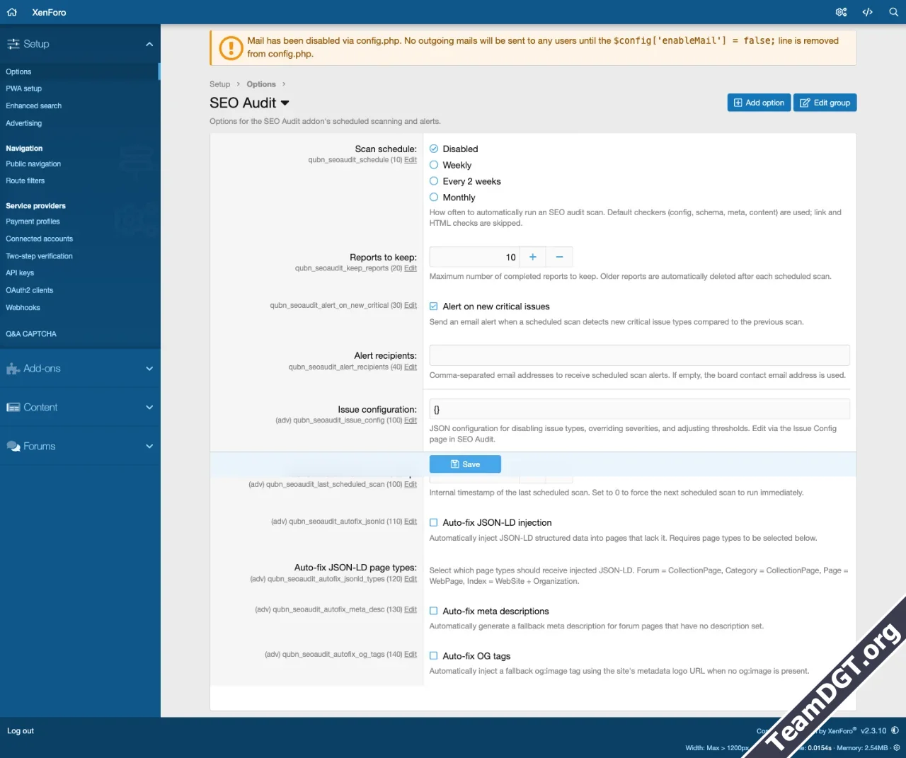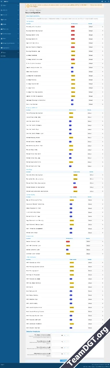 and enable JSON-LD injection, meta descriptions, or OG tag filling, then re-scan to verify reduced issue countsCode:admin.php?seo-audit/auto-fix - Customize thresholds and severity levels under Admin CP > Setup > Options > SEO Audit