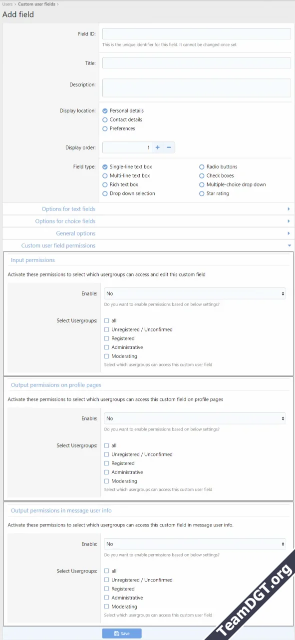 • Output permissions on profile pages: select which usergroups can access the custom field on profile pages